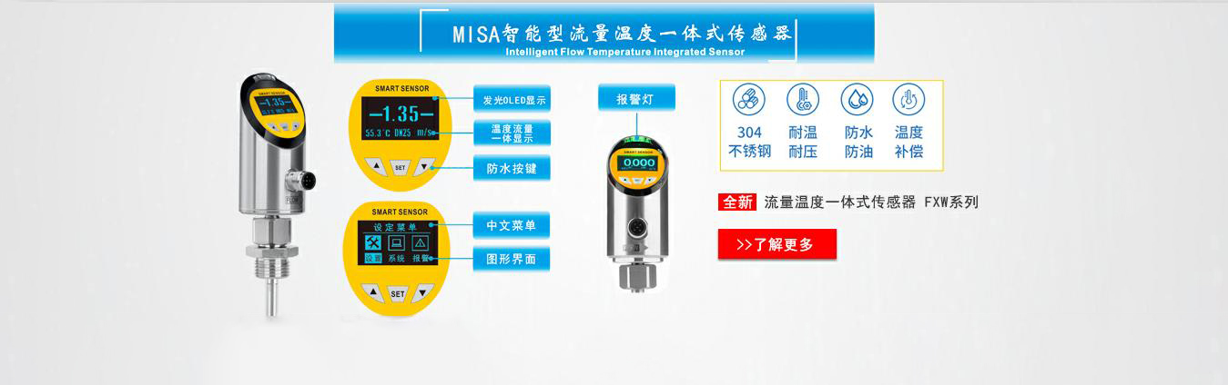 MS-FXG 流量溫度傳感器產品特點: 1、溫度和流量 一體式傳感器 2、自發(fā)光OLED;顯示清晰銳利 3、溫度智能顯示報警接點輸出 4、流量智能顯示報警接點輸出 5、中文+圖形界面;傻瓜式菜單 6、數字通信;模擬量一體式 7、精度高穩(wěn)定性好 8、耐結垢,耐腐蝕 8、全灌封設計全防水殼體 9、耐壓高、高壓型可耐壓10MPa 10、手機掃碼安裝指導功能;無需說明書在線工程師專業(yè)服務